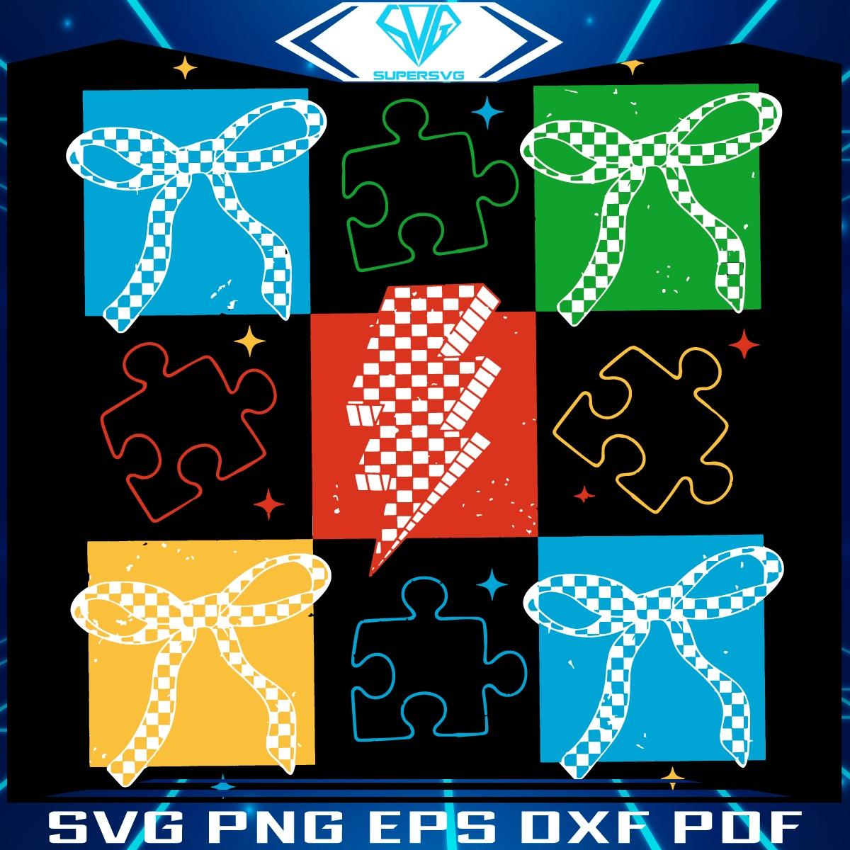Elevate Your Artistry: Digital Download Details for Retro Colorful Checkered Autism Puzze Coquette Bow Svg